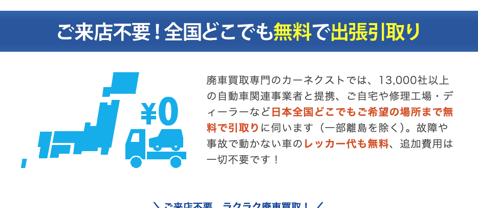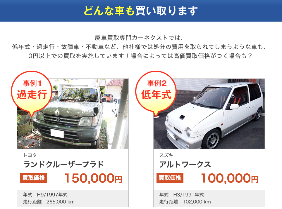 一般的な中古車店では値段が付きづらい条件でも、再販・部品活用・輸出など複数の出口がある事業者なら評価方法が変わります。カーネクストのようなサービスは、こうしたケースでも相談先になり得ます(※車種・状態・地域によって結果は異なります)。